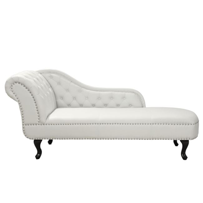Ανάκλινδρο τύπου chesterfield καπιτονέ από λευκό τεχνόδερμα υψηλής ποιότητας και ενισχυμένο ξύλινο σκελετό στο εσωτερικό του και στα πόδια.