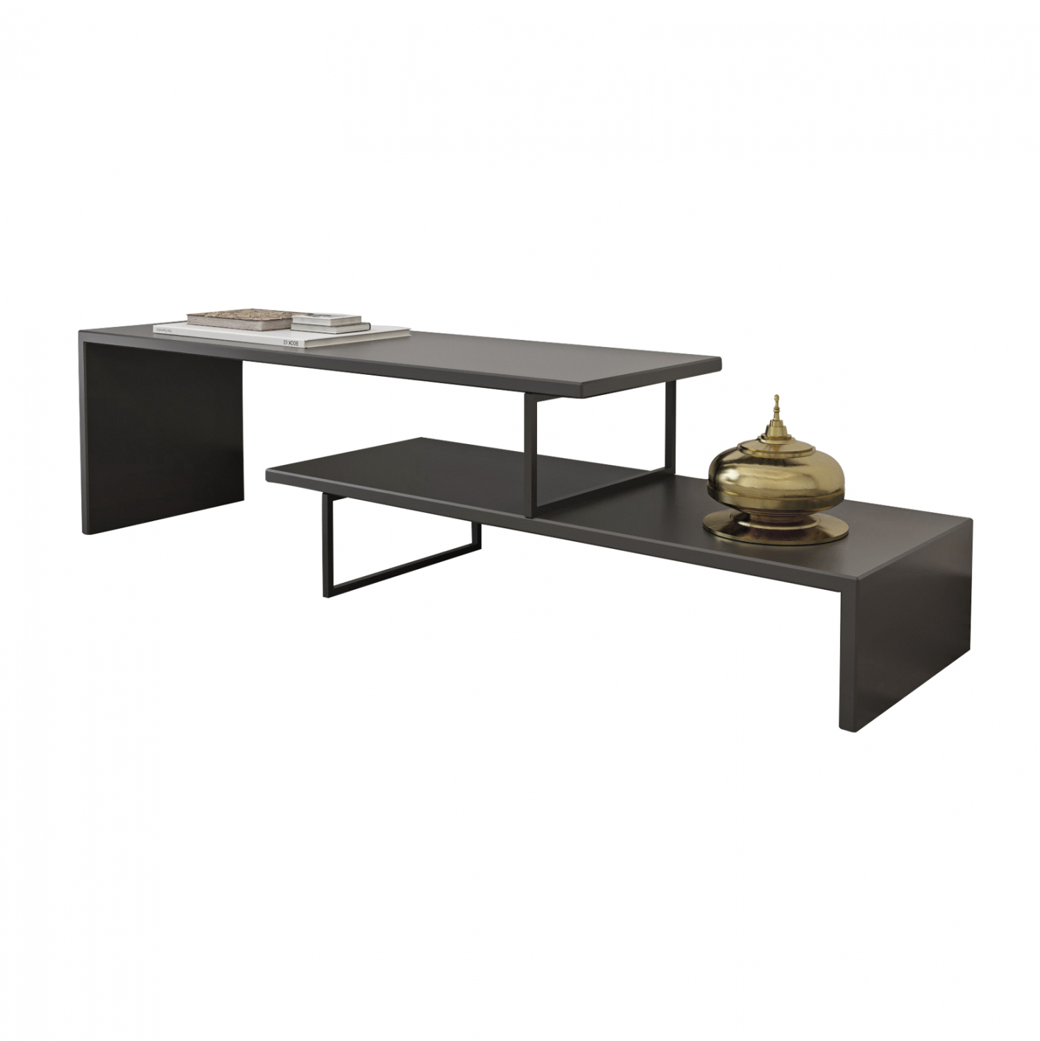 Έπιπλο τηλεόρασης με λιτό σχεδιασμό, κατασκευασμένο από ανθεκτική μελαμίνη πάχους 18 χιλιοστών, σε ανθρακί απόχρωση και μαύρα μεταλλικά πόδια.