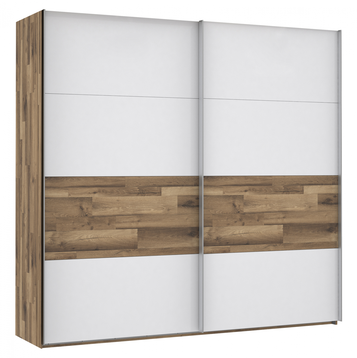 Συρόμενη ντουλάπα δίφυλλη, σε μοντέρνο αλλά και λιτό σχεδιασμό, κατασκευασμένη από ανθεκτική μελαμίνη υψηλής ποιότητας, σε όμορφη διχρωμία από καρυδί και λευκή απόχρωση.