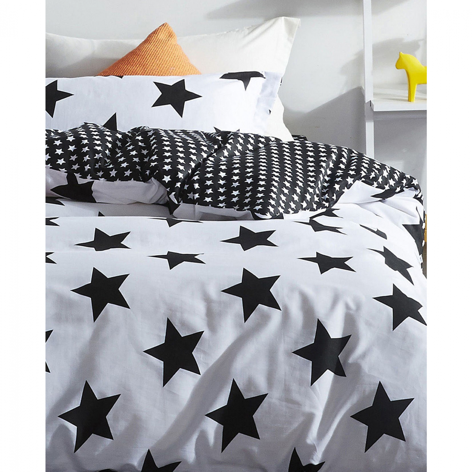 Πρόκειται για ένα σετ άριστης ποιότητας, κατασκευασμένο από 65% βαμβάκι και 35% πολυεστέρα, 120 κλωστών, σε λευκή και μαύρη απόχρωση με star pattern.
