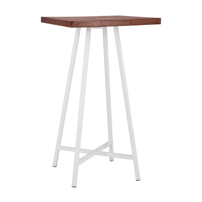 Σταντ μπαρ με μεταλλικό πόδια σε λευκή απόχρωση και με ξύλινη επιφάνεια από μασίφ έλατο σε καρυδί απόχρωση.